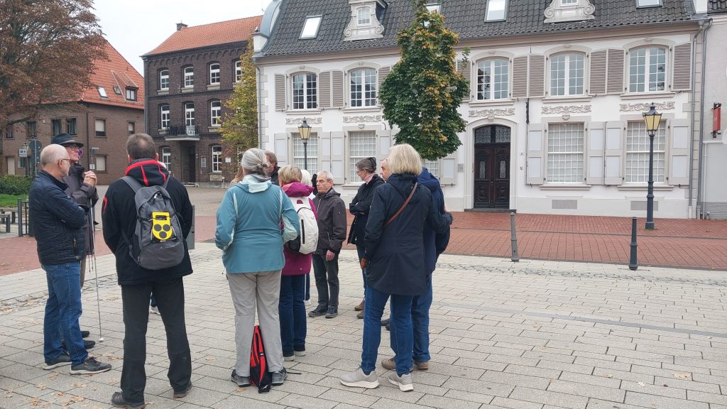 Bild 1 (Titelbild) zeigt unsere Gruppe auf dem Marktplatz von Rheinberg. Im Hintergrund ist ein reich verziertes historisches weißes Gebäude zu sehen.
