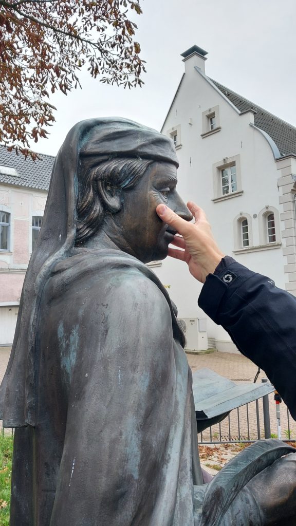 Gestartet sind wir am Marktplatz. Dort befindet sich das bronzene Standbild eines bedeutenden Bürgers der Stadt Rheinberg. Amplonius Rating de Berka, geb. 1364, war Gelehrter, Arzt und leidenschaftlicher Sammler kunstvoller, handgeschriebener Bücher.