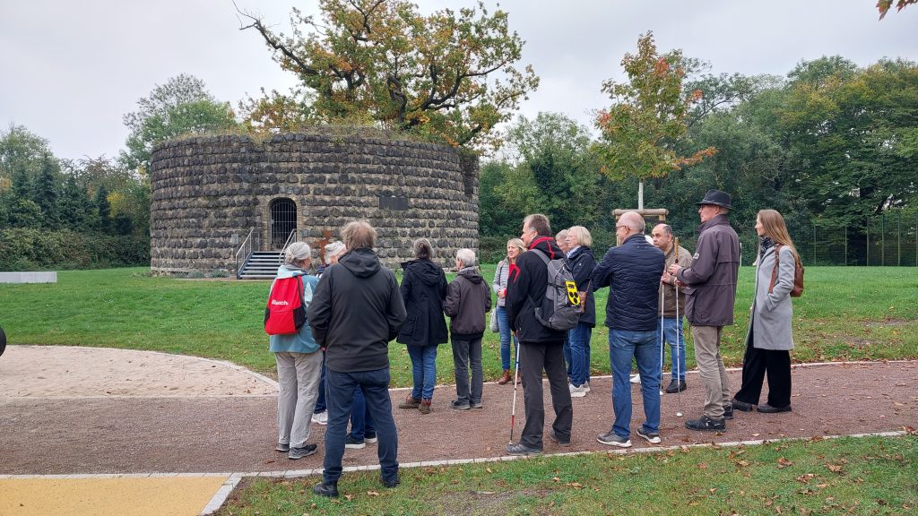 Bild 4 zeigt unsere Gruppe vor der Ruine des Zollturms. Der Turm ist rund angelegt und die dunklen Basaltsteine sind in Reihen erkennbar.