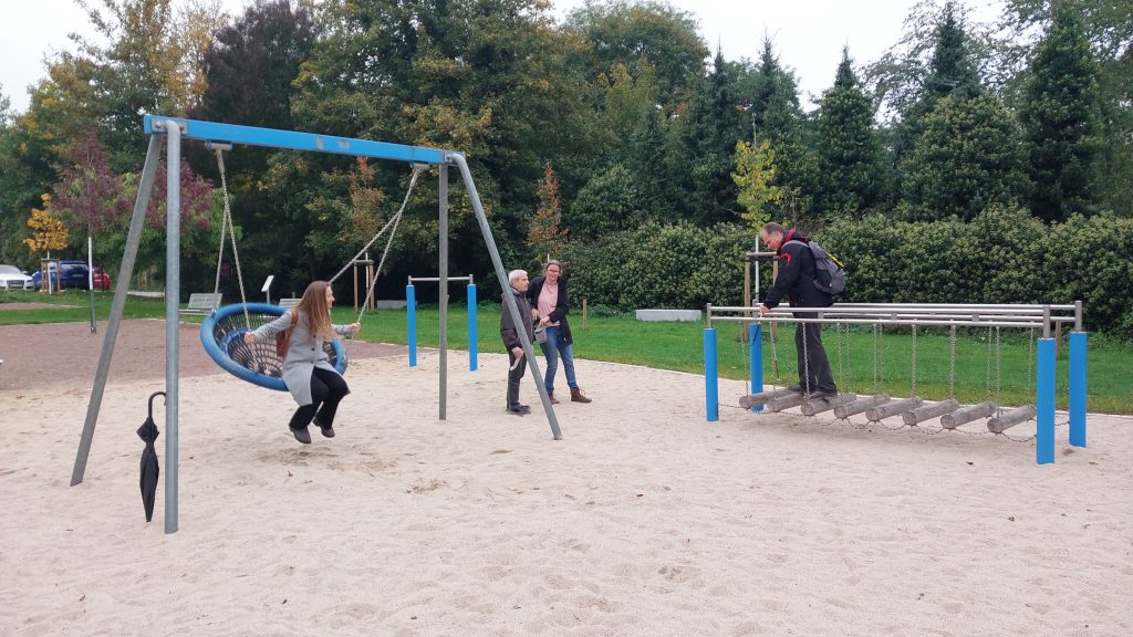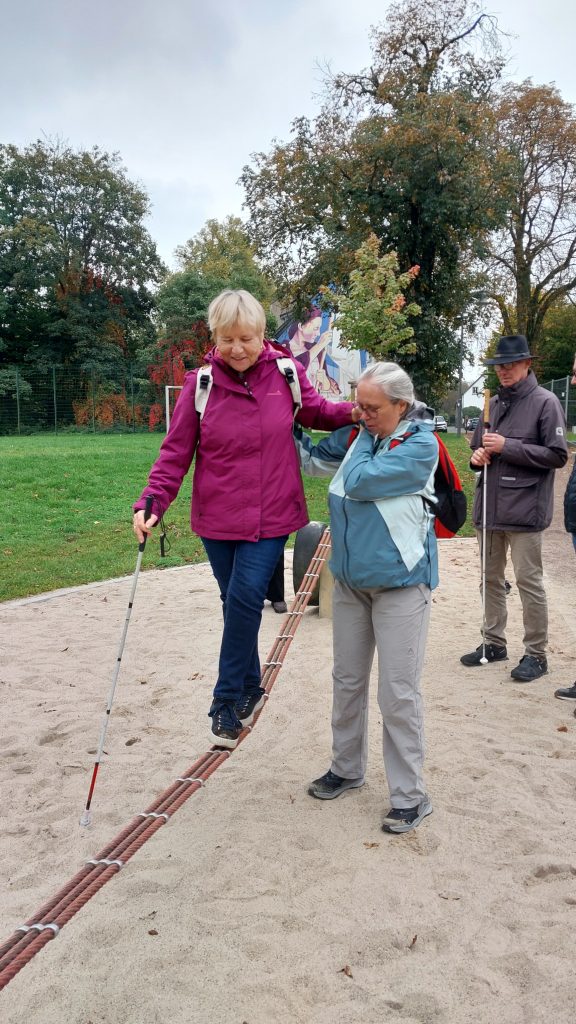 Schöne Spielgeräte, die den Gleichgewichtssinn herausfordern, sind dort installiert. Gerade für blinde und sehbehinderte Menschen ist das Training des Gleichgewichts elementar wichtig. Und die Geräte wurden selbstverständlich sofort getestet. Balanciergeräte, Wippe, Schaukel, alles wurde ausprobiert. Plätze mit solch tollen Bewegungsmöglichkeiten sollte es viel öfter auch für Erwachsene geben, damit die Menschen in Bewegung kommen und bleiben.