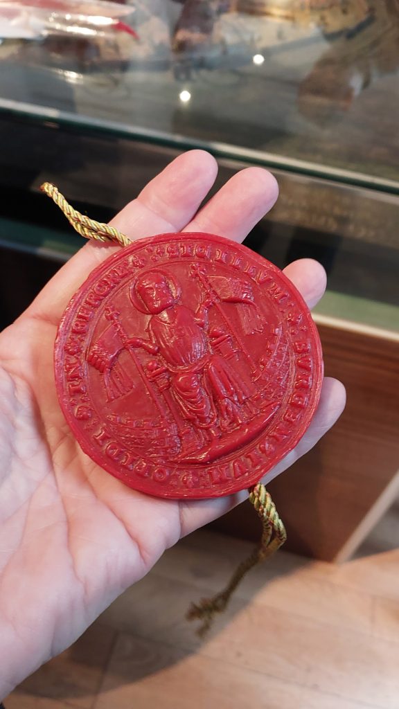 Bild 9 zeigt eine Kopie des Rheinberger Stadtwappens aus rotem Wachs in der Hand eines Mitglieds.