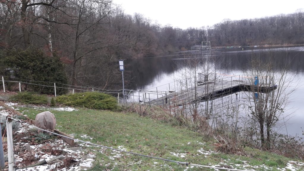 Bild 6 zeigt unseren Steg und einen Teil des Ufers. Es sind Schneereste zu sehen. Der Schwimmsteg liegt höher im Wasser als im Sommer.