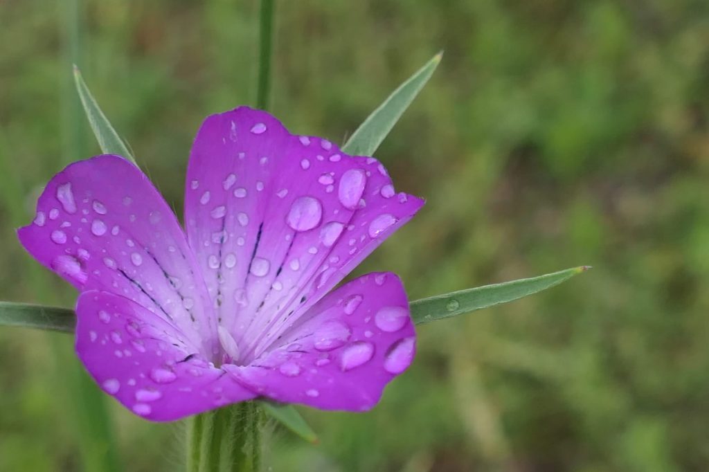 Bild 1 und Titelbild: Das Bild zeigt eine Kornradenblüte in Großaufnahme. Die Blüte hat vier lilafarbene Blätter auf denen Regentropfen zu sehen sind.